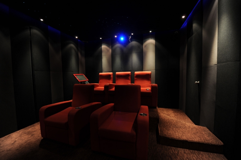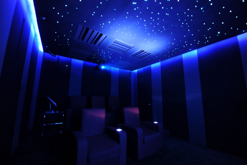 影院的构建过程、声学和光学处理及特别设计: | T先生喜欢娱乐,也喜欢简单,所以我们根据他的要求和整体房间的情况,决定做全嵌入式;当然,这也包括他自己的吉他音箱。 房间整体选用黑灰色调,既能保证光线要求,又能凸显出沉稳低调的感觉,加上淡蓝色星星顶的点缀,还让人有一种别样的心旷神怡。 座椅采用5个独立,上下两层的形式,后排比前排略高,保证了每个座位的观看视角。 最困难的莫过于声学处理了,因为是联排别墅,还是在三层位置,那么隔音就显得格外重要和棘手。所以我们在隔音上下足了功夫,把所有的墙面(包括顶面和地面)全部做了隔音处理,其中还包括减震垫和弹性减震墙并且去隔壁家里用声压仪进行测试,确保隔音万无一失。在保证隔音的基础上,再对内部进行吸音及声反射的处理,保证音质。 |