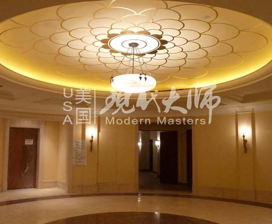 现代大师艺术涂料品牌,有专门针对灯池装饰的产品系列。像现代大师的质感涂料美泰丽系列、质感涂料艺术金银箔系列等都是作为灯池装饰的理想材料。因为,这些产品本身的装饰特性再加上与灯光融合之下的效果,形成了一种金碧辉煌的高贵感觉。